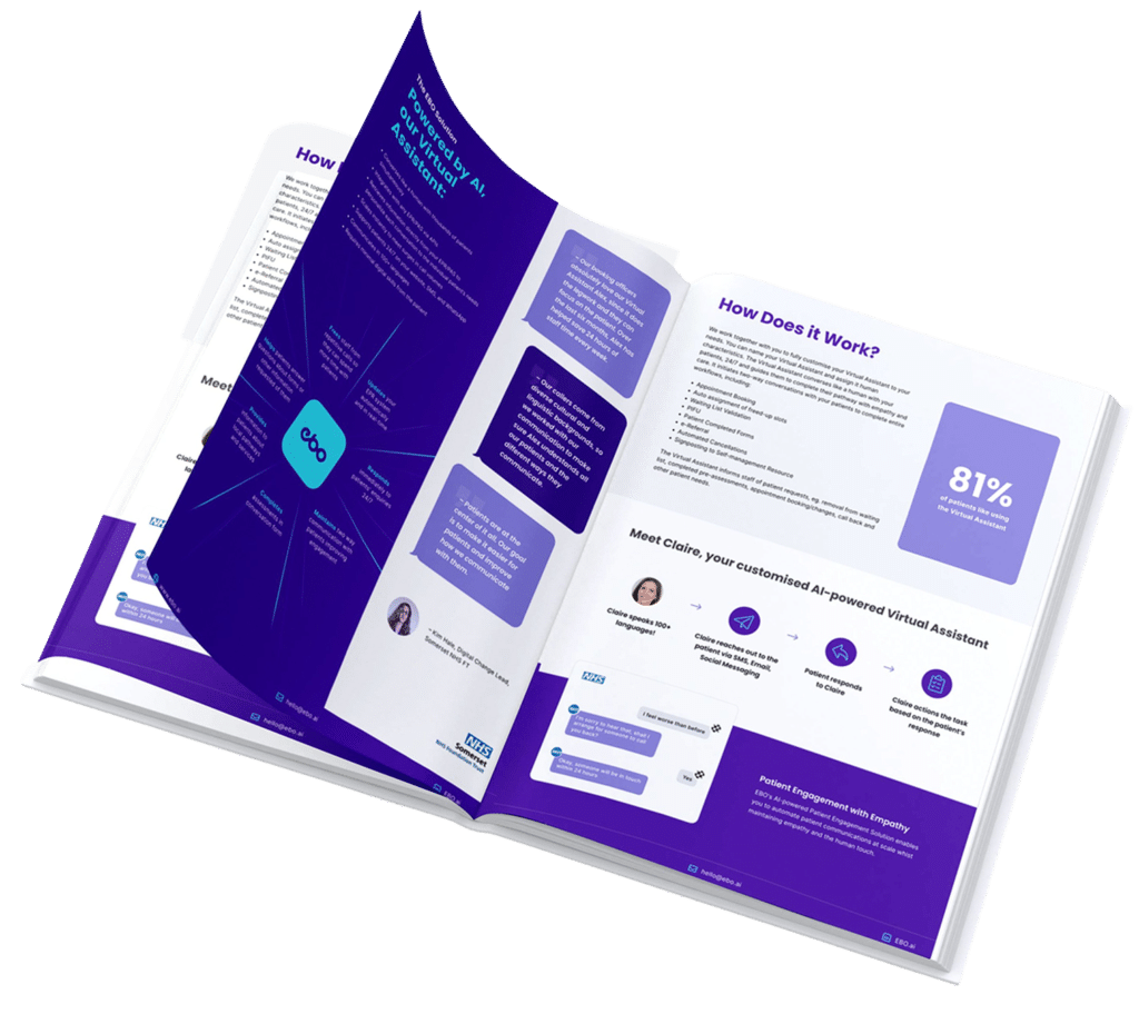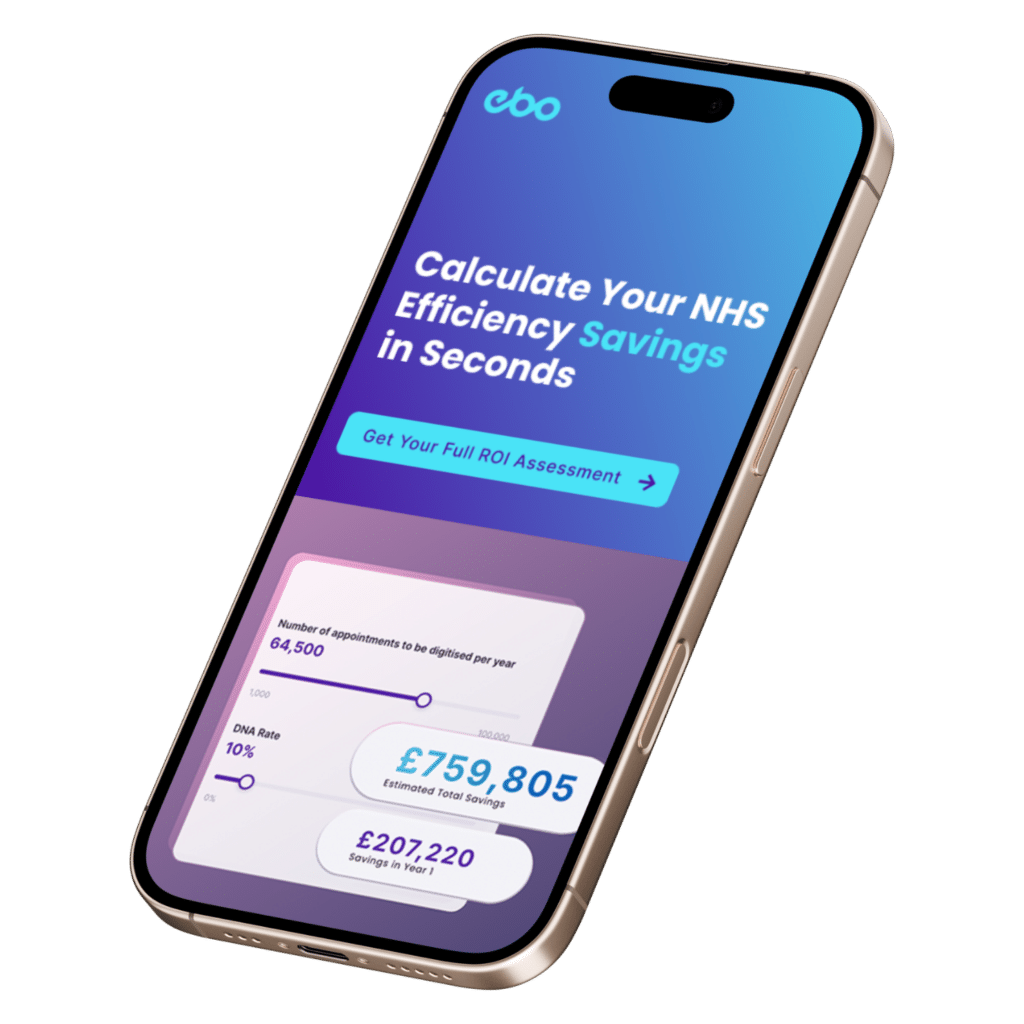 Discover your projected financial impact, clinical time released, and DNA reduction potential with EBO’s AI. Complete the form to receive your tailored NHS savings report.