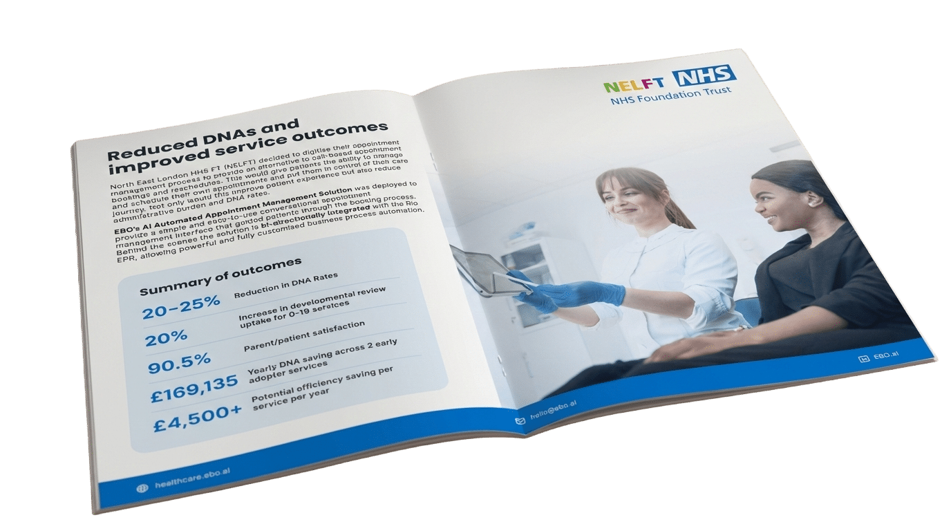 Before deploying EBO’s AI Automated Appointment Management Solution, NELFT relied heavily on letters and telephone lines (operating between 9am and 5pm) to manage patient bookings. Patients didn’t have a digital way to arrange or adjust their appointments. As a result, staff spent significant time booking and rebooking appointments manually, whilst DNA rates also increased.